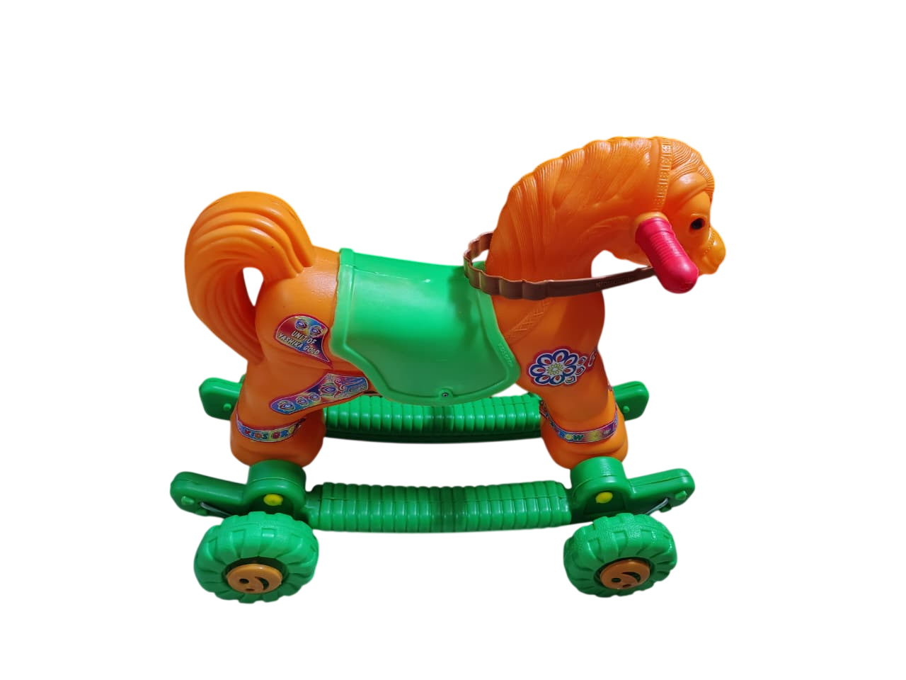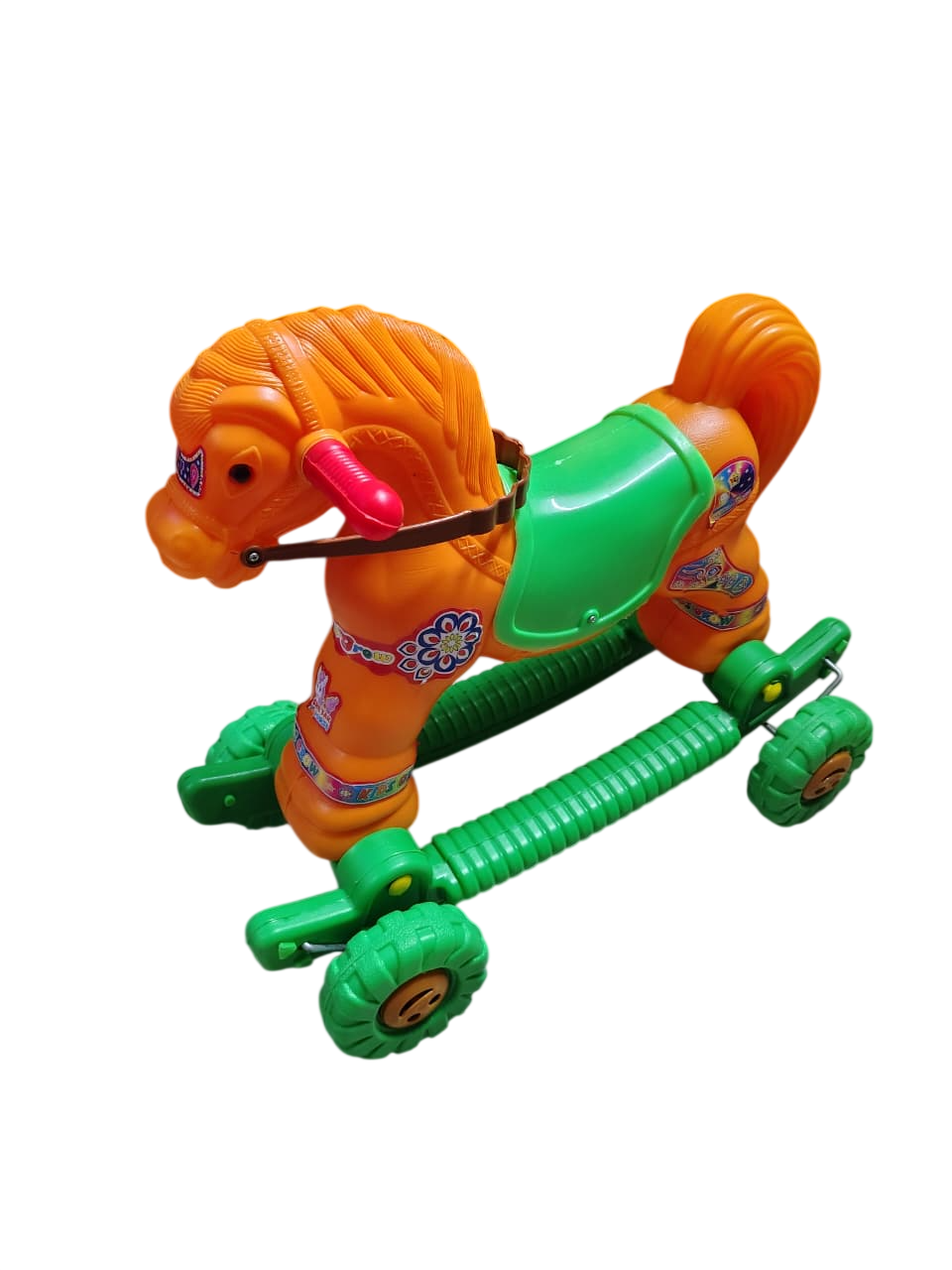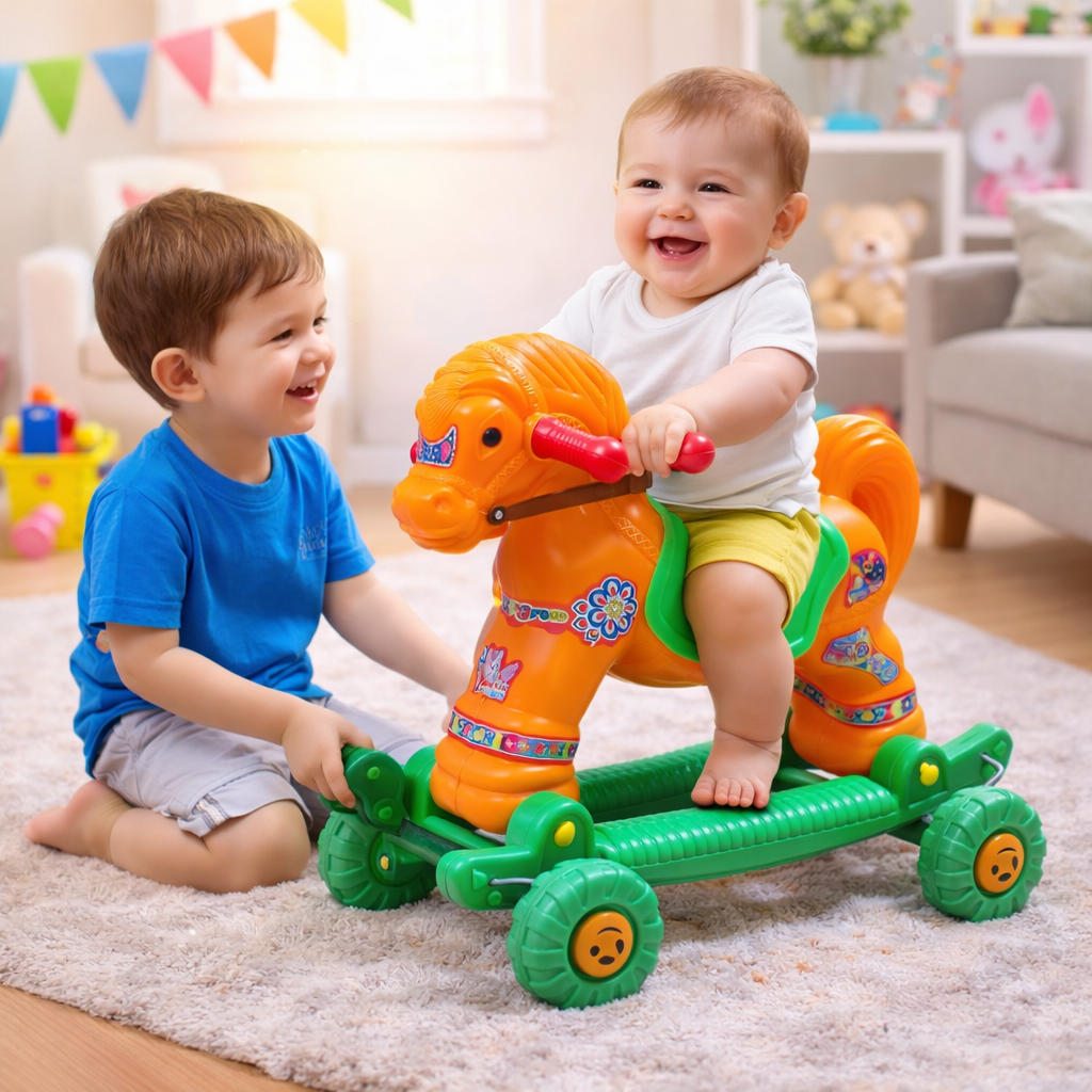 Make playtime exciting and developmental with this 2-in-1 Kids Ride-On Horse Rocker with Wheels, specially designed for toddlers aged 1 to 3 years. This versatile toy easily switches between a gentle rocking horse and a smooth ride-on wheeled toy, providing hours of fun both indoors and outdoors. The safety handle, supportive backrest, and wide stable base help keep little riders secure while they enjoy rocking or rolling. Crafted from durable, child-safe plastic with smooth edges, the toy ensures safe, long-lasting everyday use. Beyond fun, this baby horse rider toy supports balance development, coordination, and motor skill growth, making it an ideal learning and activity toy for toddlers. Its bright multicolour design adds cheerful appeal and makes it a perfect gift choice for birthdays, festivals, or special occasions.