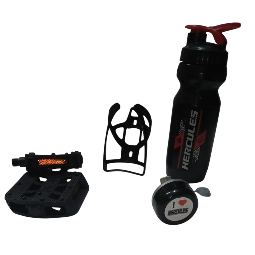 Enhance your cycling experience with this comprehensive bicycle accessory combo that includes everything you need for a comfortable ride. The set features a spacious 750ml water bottle with a sturdy holder to keep you hydrated during long rides, a classic black bell for safety signalling, and a pair of pedals equipped with reflectors for improved visibility. The pedals are designed with a durable steel construction and feature orange reflectors for added safety during low-light conditions. This versatile combo pack offers universal compatibility, fitting perfectly on mountain bikes, road cycles, and children’s bicycles. The water bottle holder’s robust construction ensures your bottle stays secure even on bumpy terrain. Each component is engineered for durability and practical functionality, making this combo an essential addition to your cycling gear. The pedals provide reliable grip and comfortable foot placement, while the bell produces clear, attention-grabbing sound. This all-in-one package delivers convenience and value, eliminating the need to purchase accessories separately.