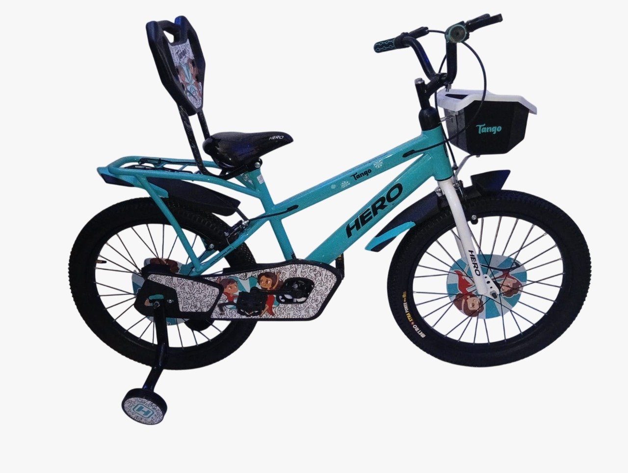The front basket is ideal for carrying toys, water bottles, or small belongings, while the rear carrier adds extra utility for family outings or school rides. The bike is designed with safety features including sturdy construction, reliable brakes, and child-friendly pedals to ensure a secure and enjoyable riding experience.